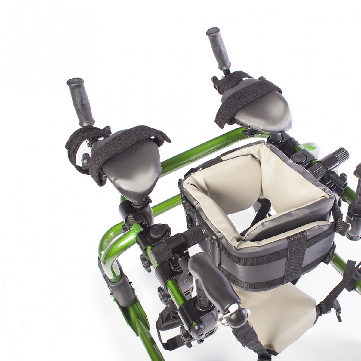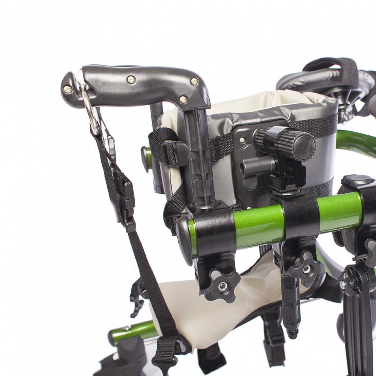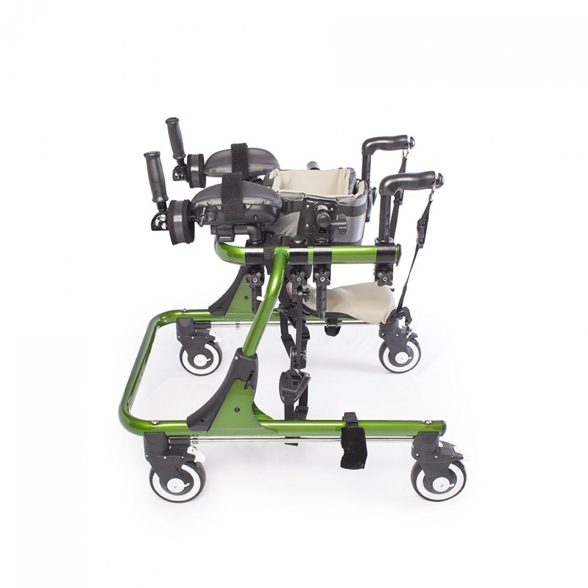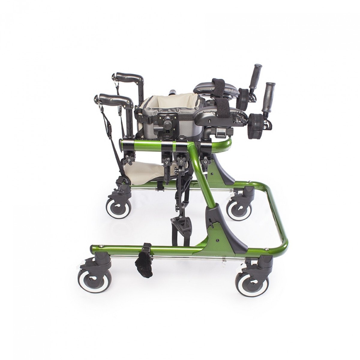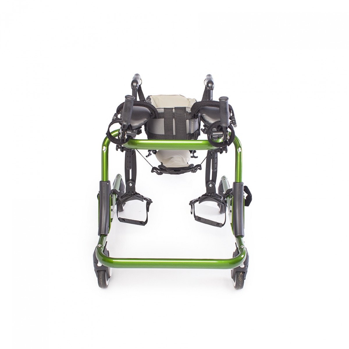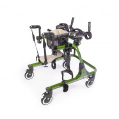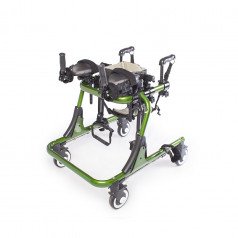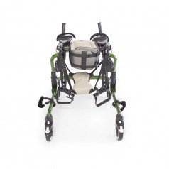 Конструкция настраивается под пользователя: регулируются высота, ширина и положение элементов, что позволяет точно адаптировать ходунки под индивидуальные особенности. Для поддержки предусмотрены фиксаторы туловища, таза, бёдер и голеностопов, а также подлокотные опоры с мягкими ремешками. Поддержка таза с мягкой подушкой помогает правильно распределять нагрузку и двигаться естественно, в такт шагу.