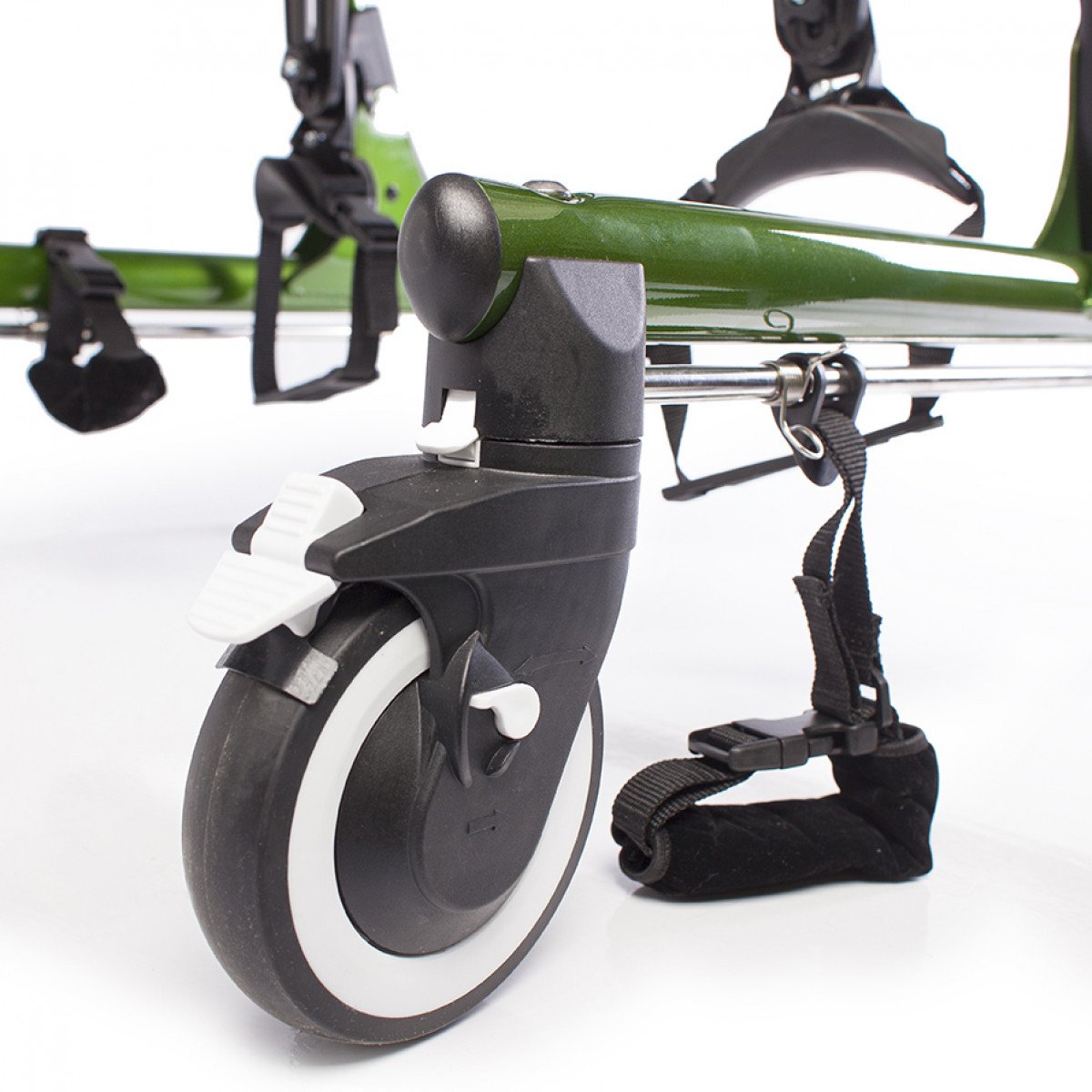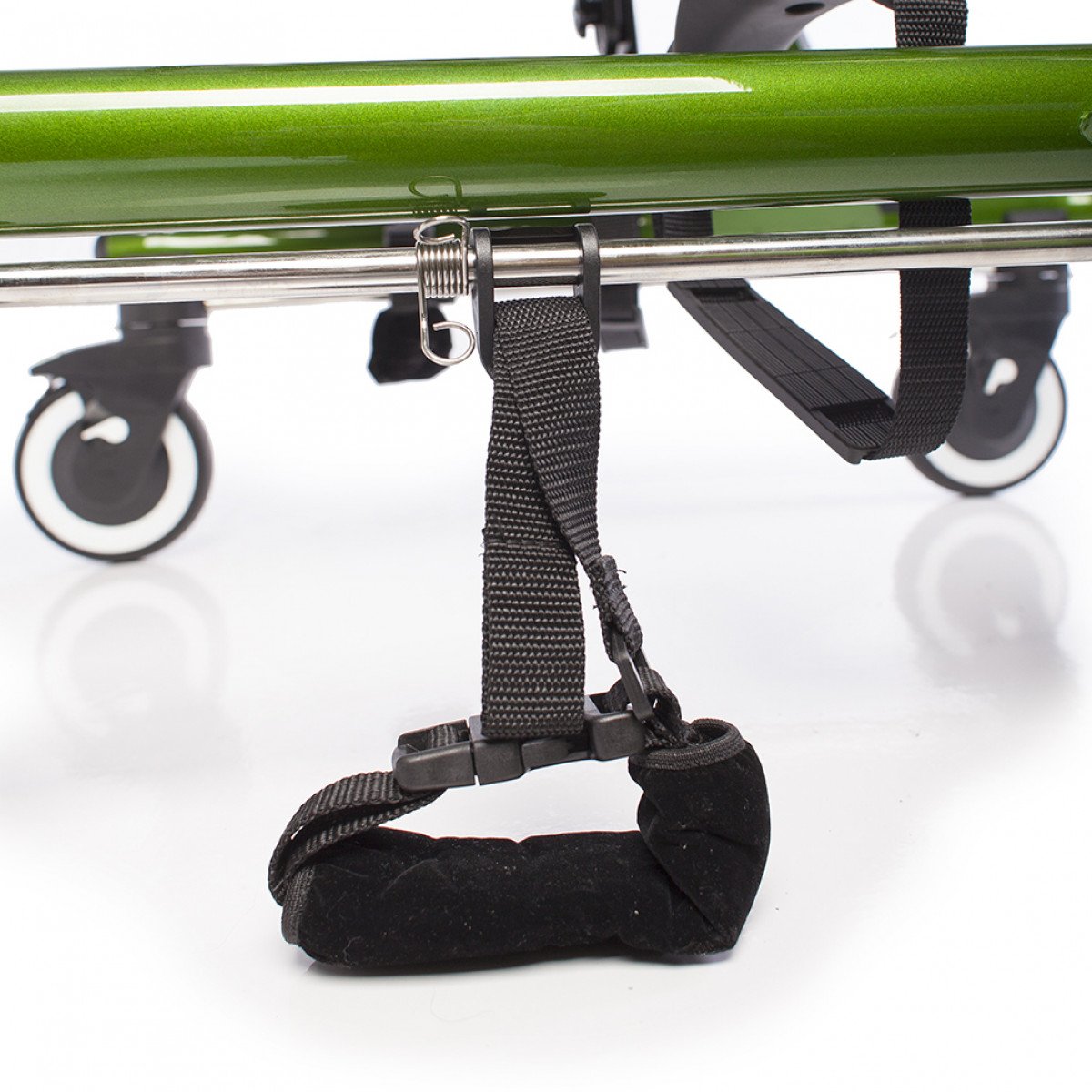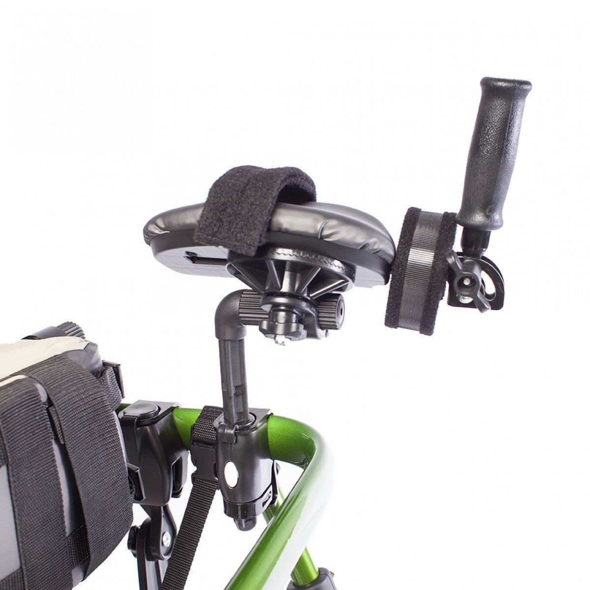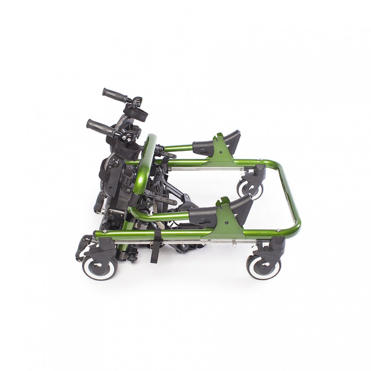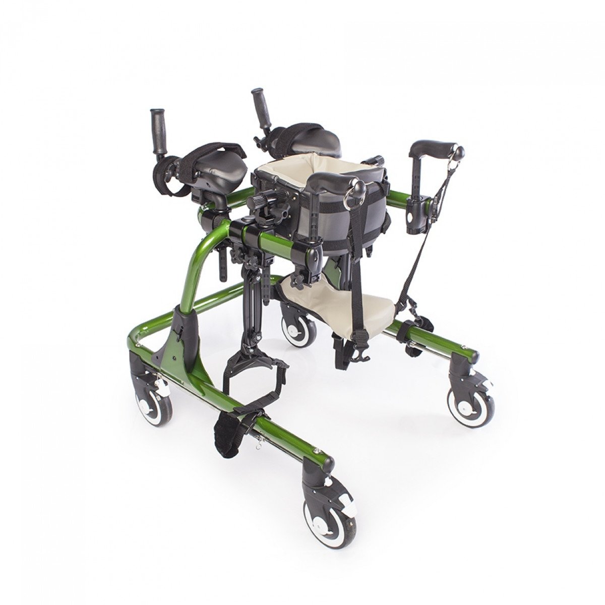 Конструкция настраивается под пользователя: регулируются высота, ширина и положение элементов, что позволяет точно адаптировать ходунки под индивидуальные особенности. Для поддержки предусмотрены фиксаторы туловища, таза, бёдер и голеностопов, а также подлокотные опоры с мягкими ремешками. Поддержка таза с мягкой подушкой помогает правильно распределять нагрузку и двигаться естественно, в такт шагу.