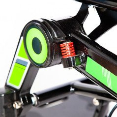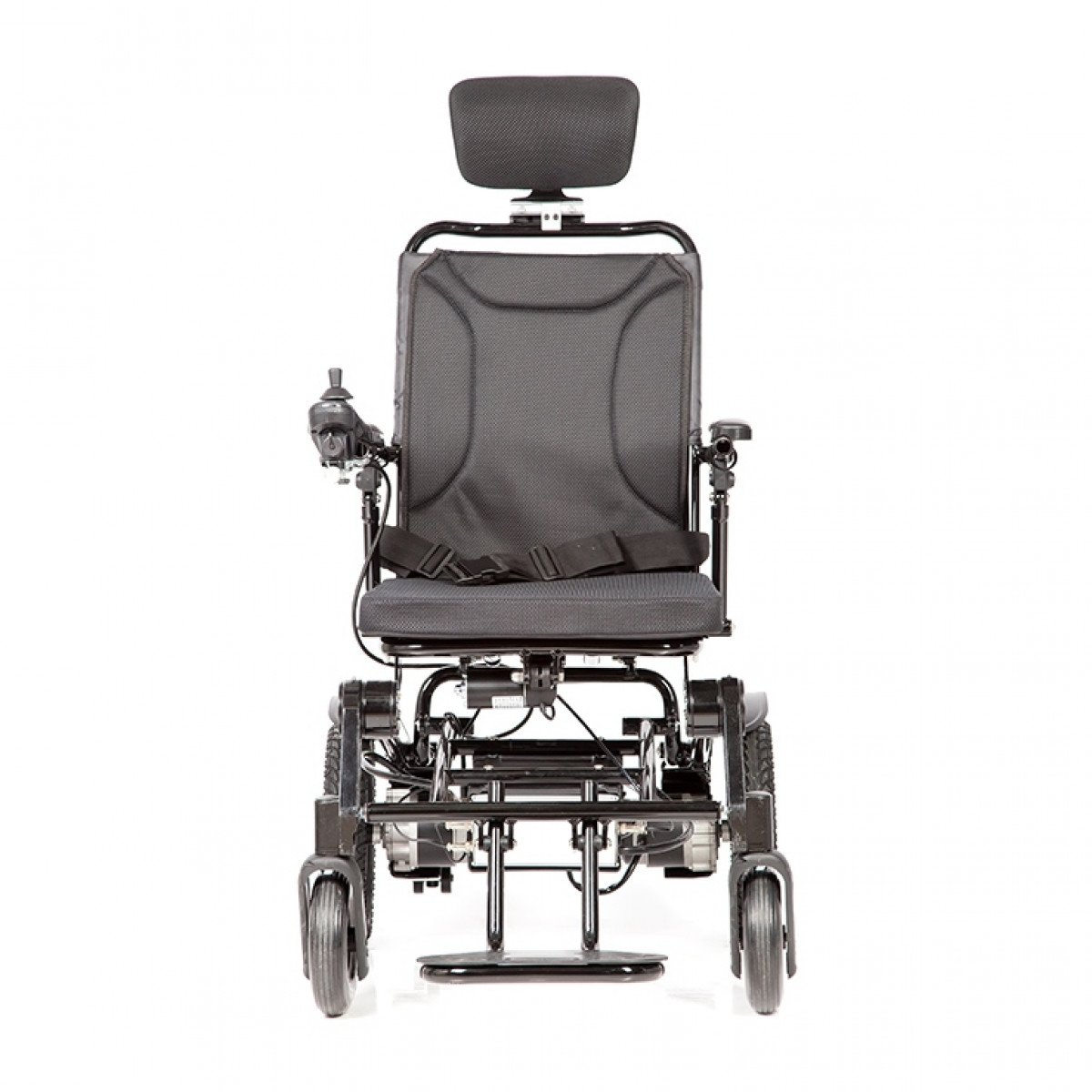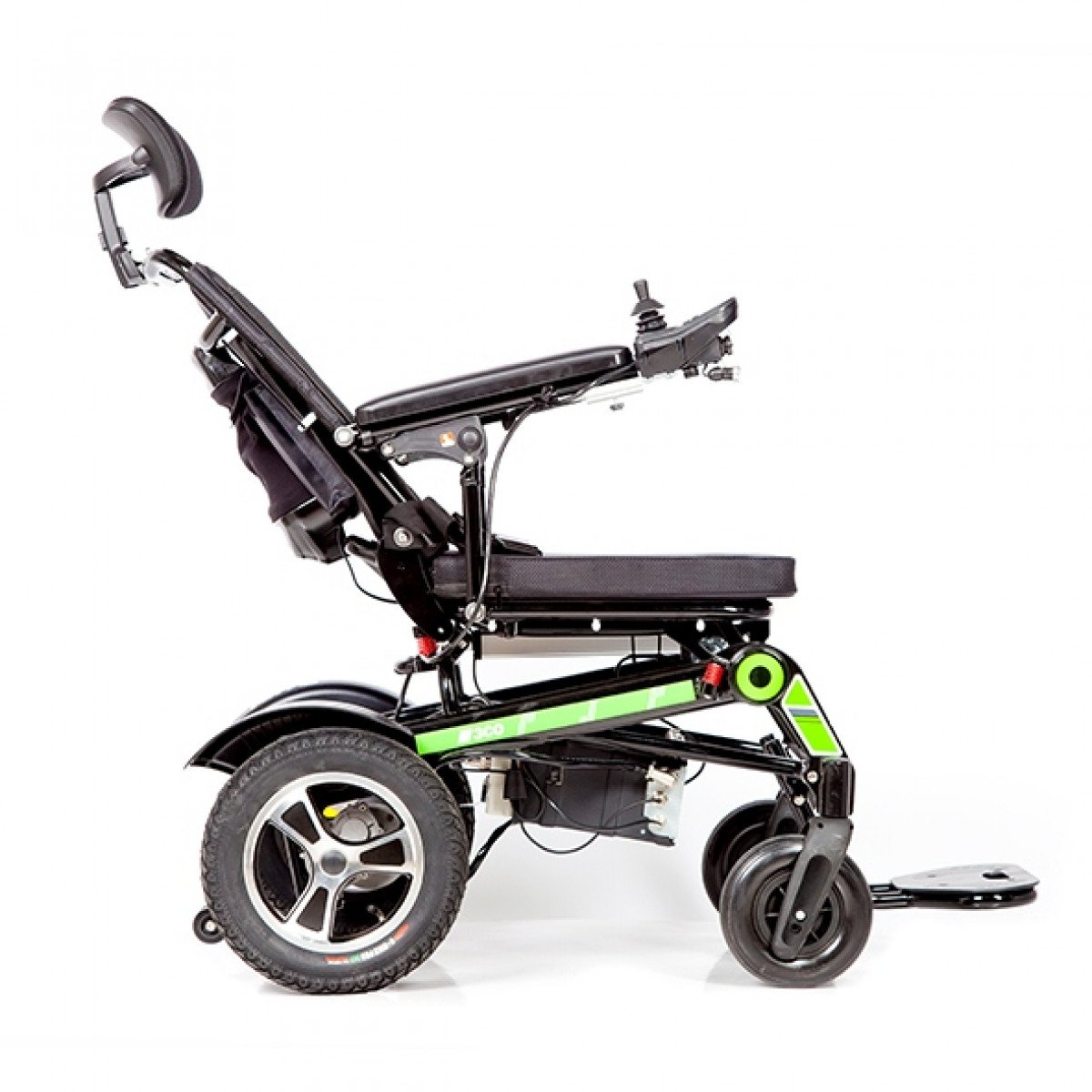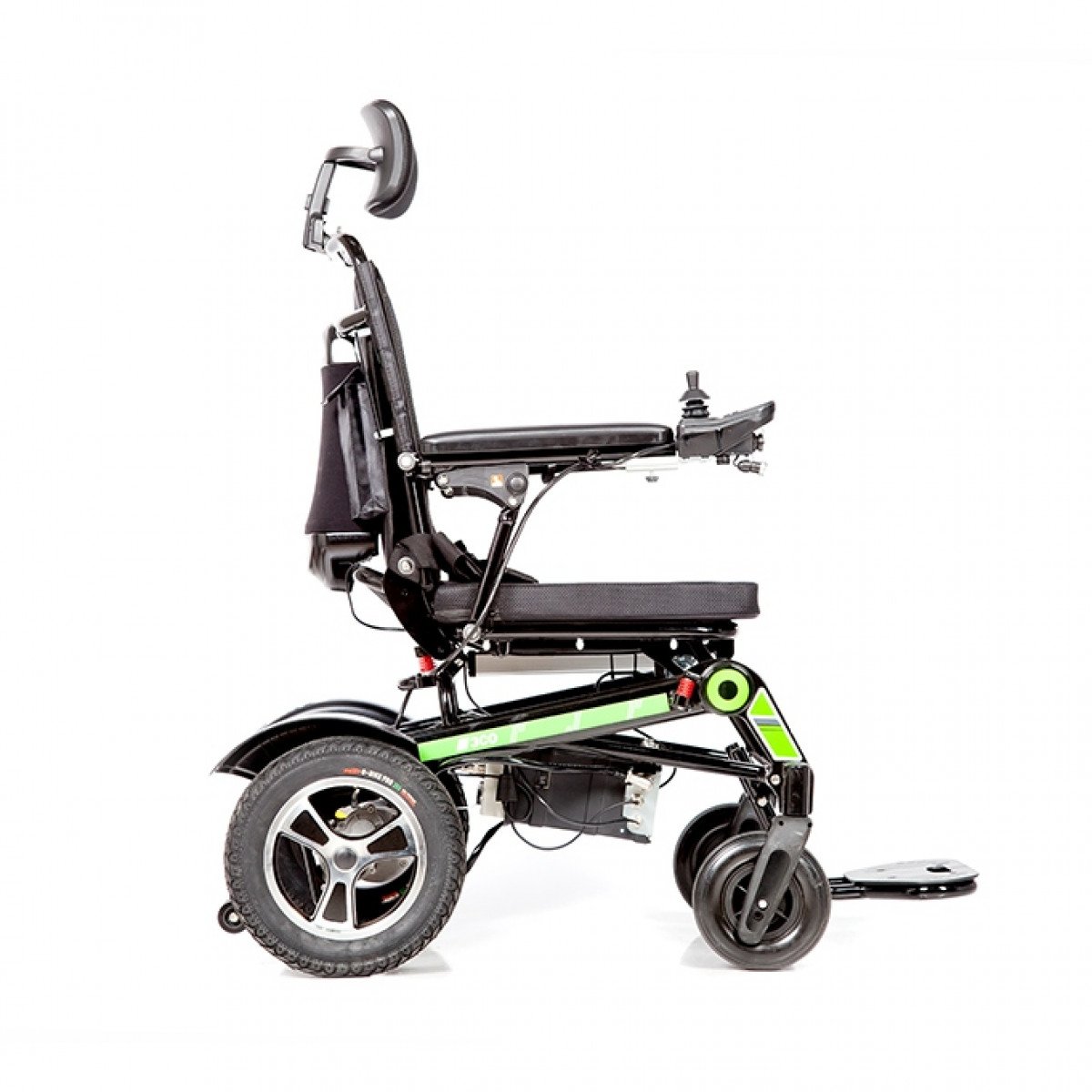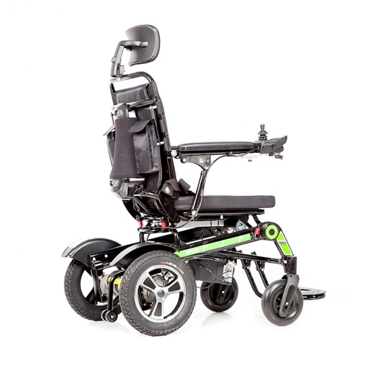 Рама изготовлена из прочного алюминия с антикоррозийным покрытием, что делает конструкцию надёжной и долговечной. Спинка складывается для удобной транспортировки. Электропривод можно отключить, чтобы использовать коляску в режиме сопровождения. Управление осуществляется манипулятором, который можно установить под любую руку и настроить по вылету, а для дополнительного удобства предусмотрен пульт дистанционного управления. В комплект входит зарядное устройство и всё необходимое для эксплуатации.