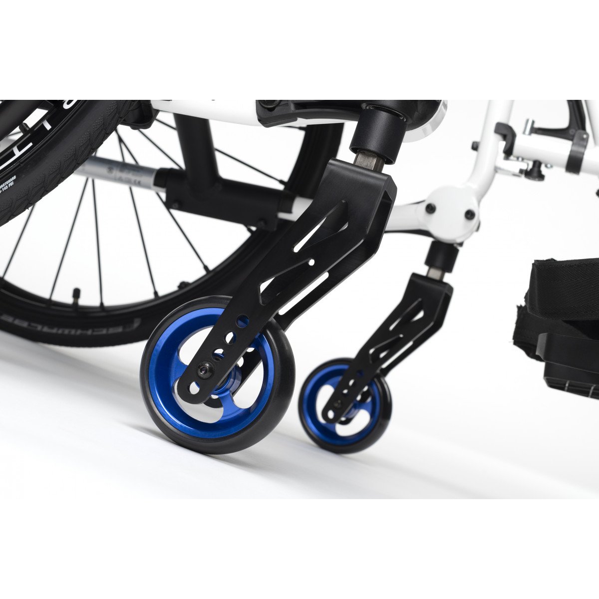 Вместо классических подлокотников активная инвалидная коляска оснащена защитными щитками. Особенностью данной модели является возможность настраивать натяжение спинки и сидения с использованием специальных ремней. Спинку можно регулировать по вертикали, а сидение – по глубине и высоте. Подножки имеют возможность снятия, а также могут быть отрегулированы по высоте или отведены в сторону.