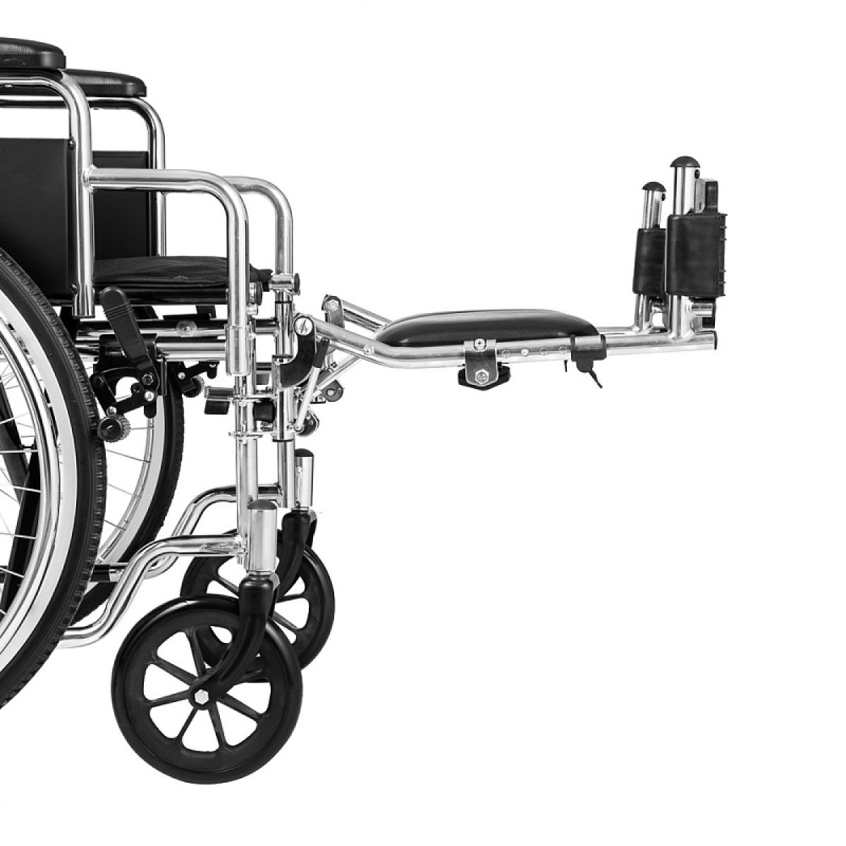 Хромированное покрытие защищает раму от коррозии и продлевает срок службы. Коляска быстро складывается без инструментов, а быстросъёмные задние колёса делают её удобной для перевозки и хранения. Для сопровождающего предусмотрены ручки, которые упрощают управление.