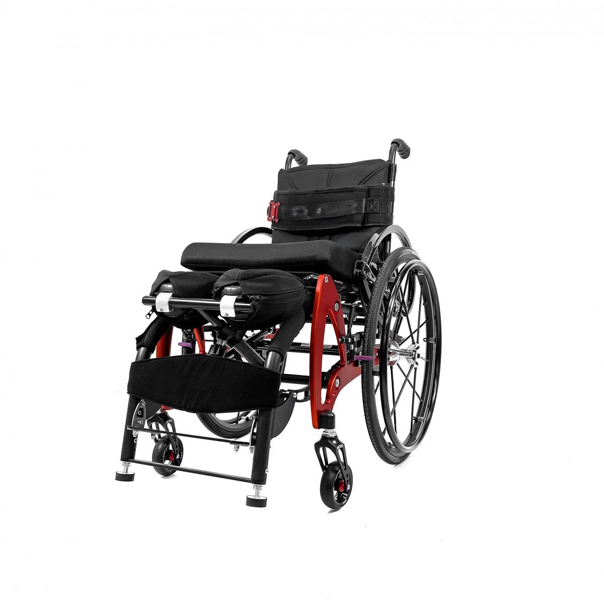 Механизм подъёма работает плавно и фиксируется в нужном положении, а ремни обеспечивают надёжную поддержку и безопасность. Вилки передних колёс регулируются по высоте, что помогает точнее настроить посадку. Обода с антискользящим покрытием упрощают управление, а стояночные тормоза обеспечивают контроль при остановке.