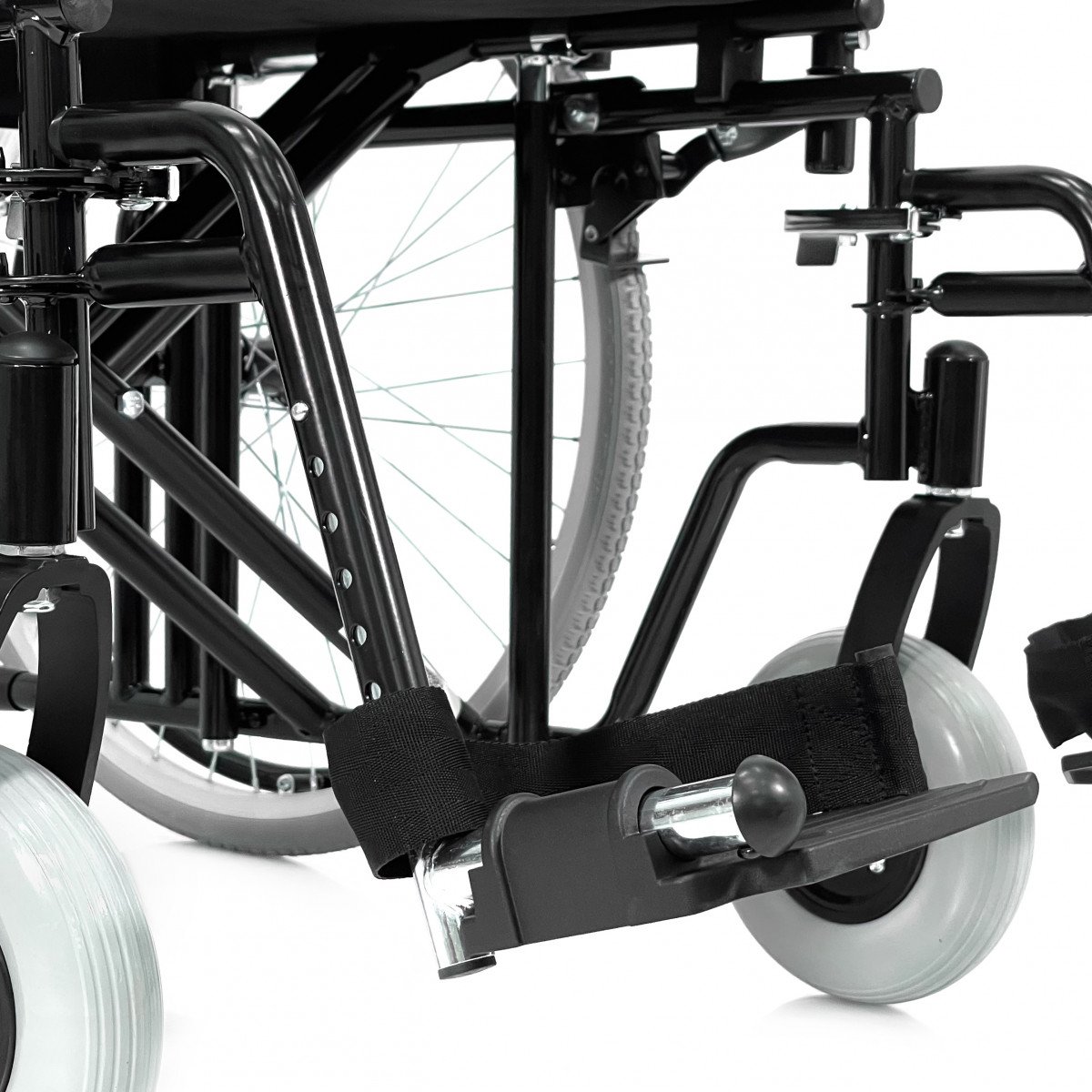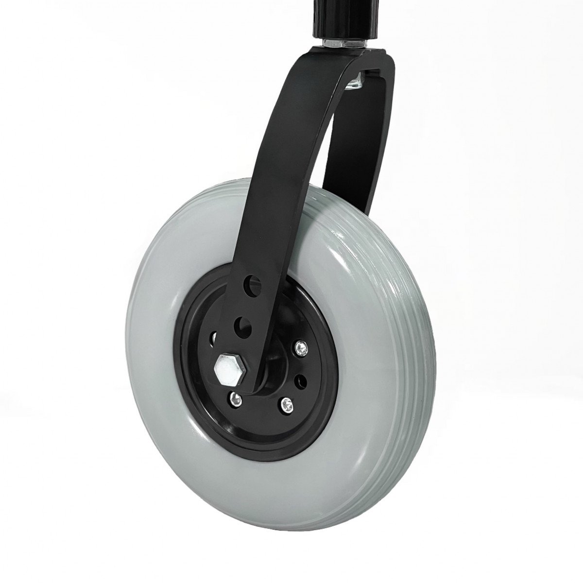 Передние колёса — самоориентирующиеся, регулируются по высоте в нескольких положениях, задние — пневматические, быстросъёмные, также с регулировкой. Такое сочетание даёт устойчивость и более мягкий ход. Подножки откидываются, снимаются и настраиваются по высоте. Для безопасности предусмотрены стояночные тормоза, а ручки с рельефными накладками делают управление для сопровождающего более уверенным.