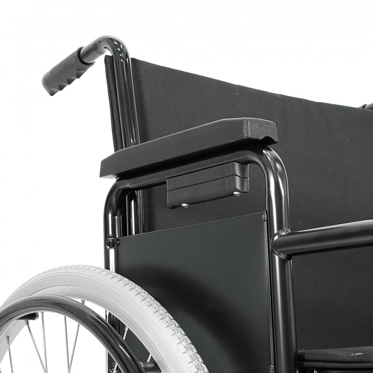 Конструкция рассчитана на длительное использование: прочная стальная рама с антикоррозийным покрытием выдерживает высокие нагрузки, а складной механизм упрощает хранение и перевозку. Сиденье и спинка выполнены из износостойкого материала, который не растягивается и легко очищается. Подлокотники — съёмно-откидные, с регулировкой по высоте: это удобно для пересаживания и позволяет подъезжать вплотную к столу.