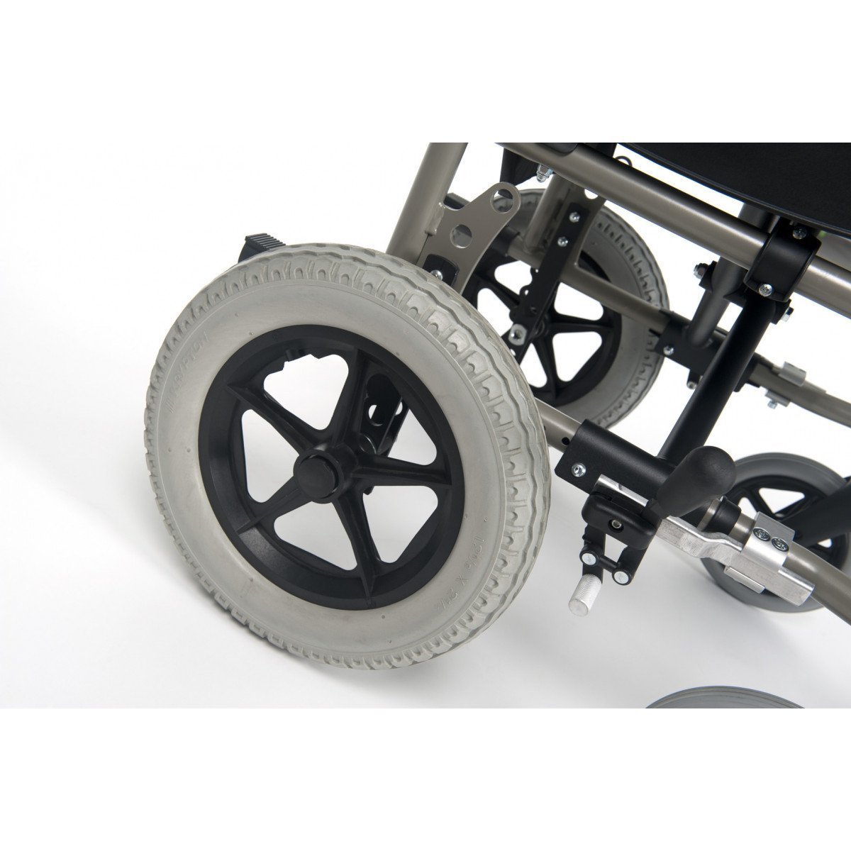 Vermeiren D200 30° легко адаптируется под анатомию человека: предусмотрены съёмные и откидные подлокотники, настраиваемые по высоте, а также возможность изменения угла наклона спинки — ключевая особенность модели. Сиденье и спинка выполнены из прочной, простой в уходе ткани. Продуманная конструкция складывания позволяет уложить спинку на переднюю раму, благодаря чему коляска занимает минимум места и удобно перевозится в багажнике автомобиля
