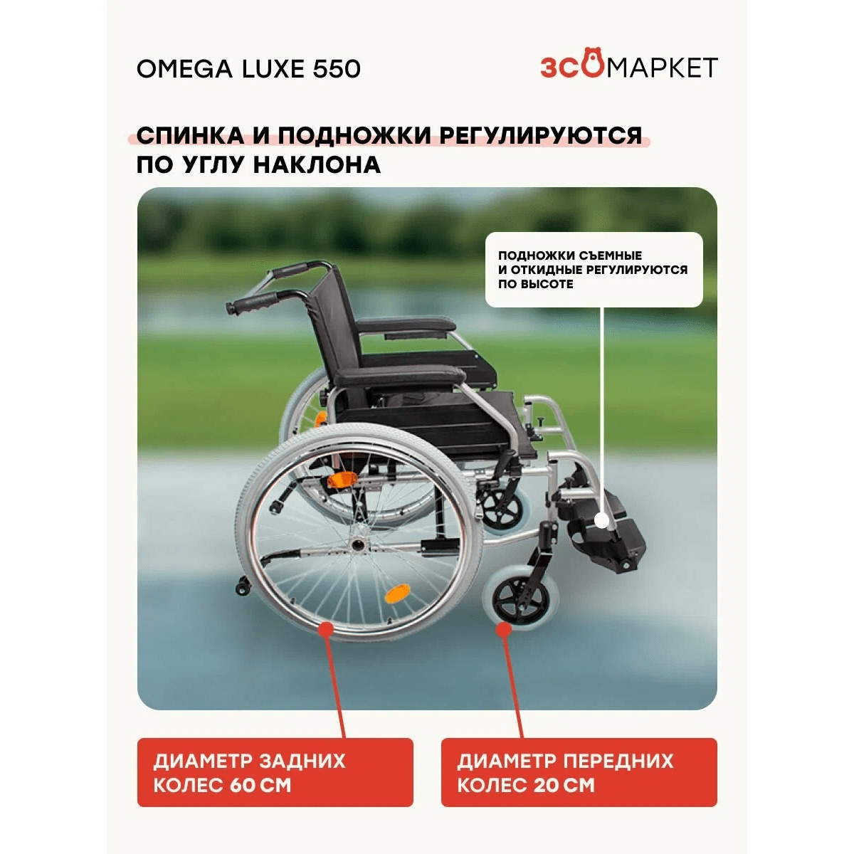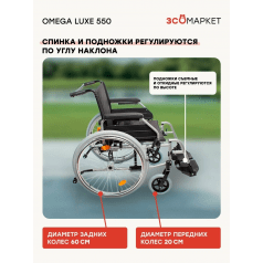 Кресло-коляска ЗСО Omega Luxe 550 (Омега Люкс 550) — универсальная модель с ручным приводом для дома и улицы. Подходит для ежедневного использования, сочетает прочную конструкцию, устойчивость и возможность точной настройки под пользователя.