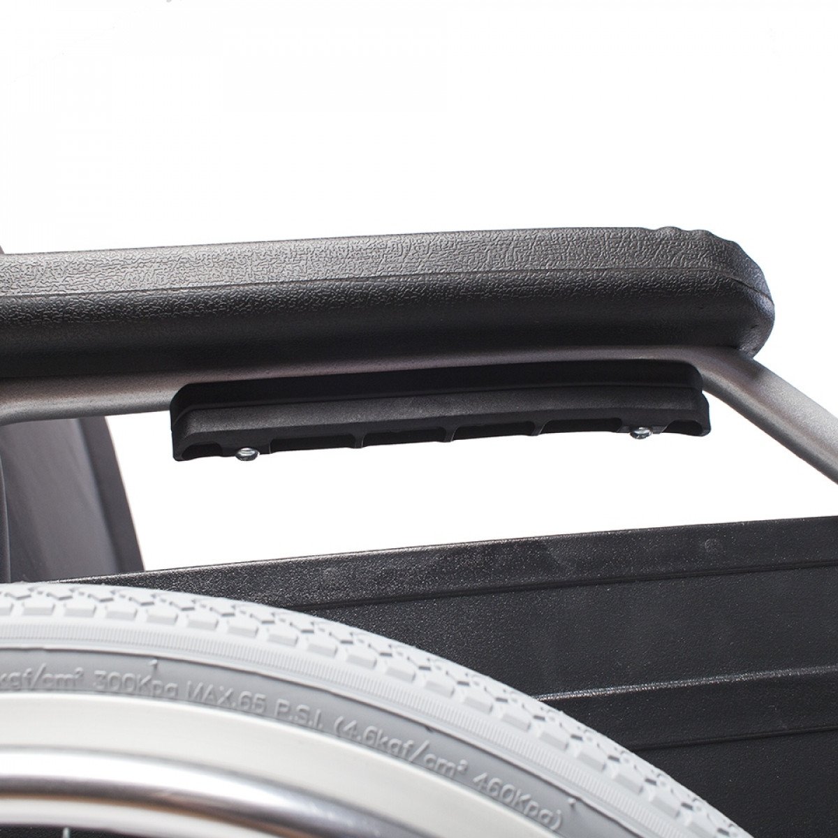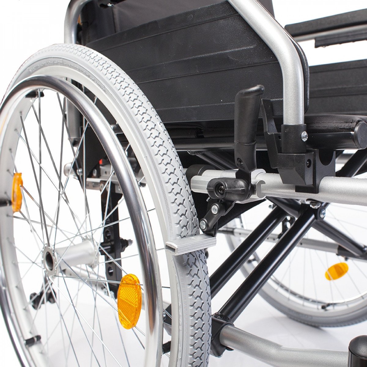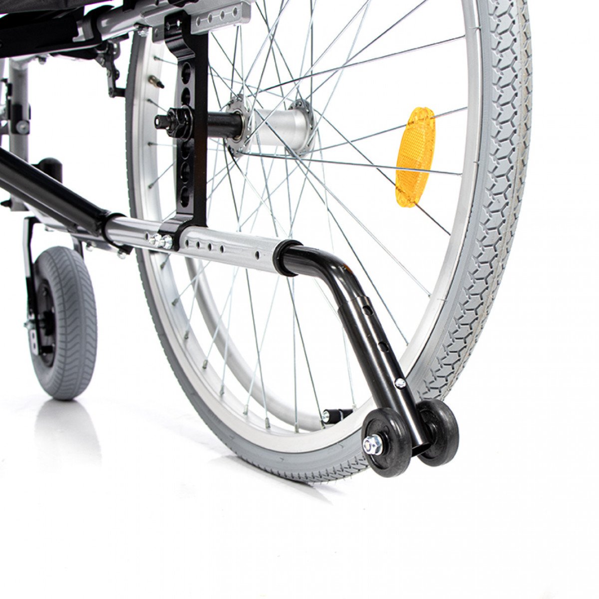 Передние и задние колёса доступны в вариантах: цельнолитые или пневматические — под разные условия эксплуатации. Задние колёса быстросъёмные, что упрощает транспортировку, а их положение можно регулировать. Для дополнительной устойчивости предусмотрен антиопрокидыватель на роликовой опоре с возможностью регулировки и снятия. Рама усилена распоркой жёсткости спинки, что помогает сохранить правильное положение пользователя во время движения.