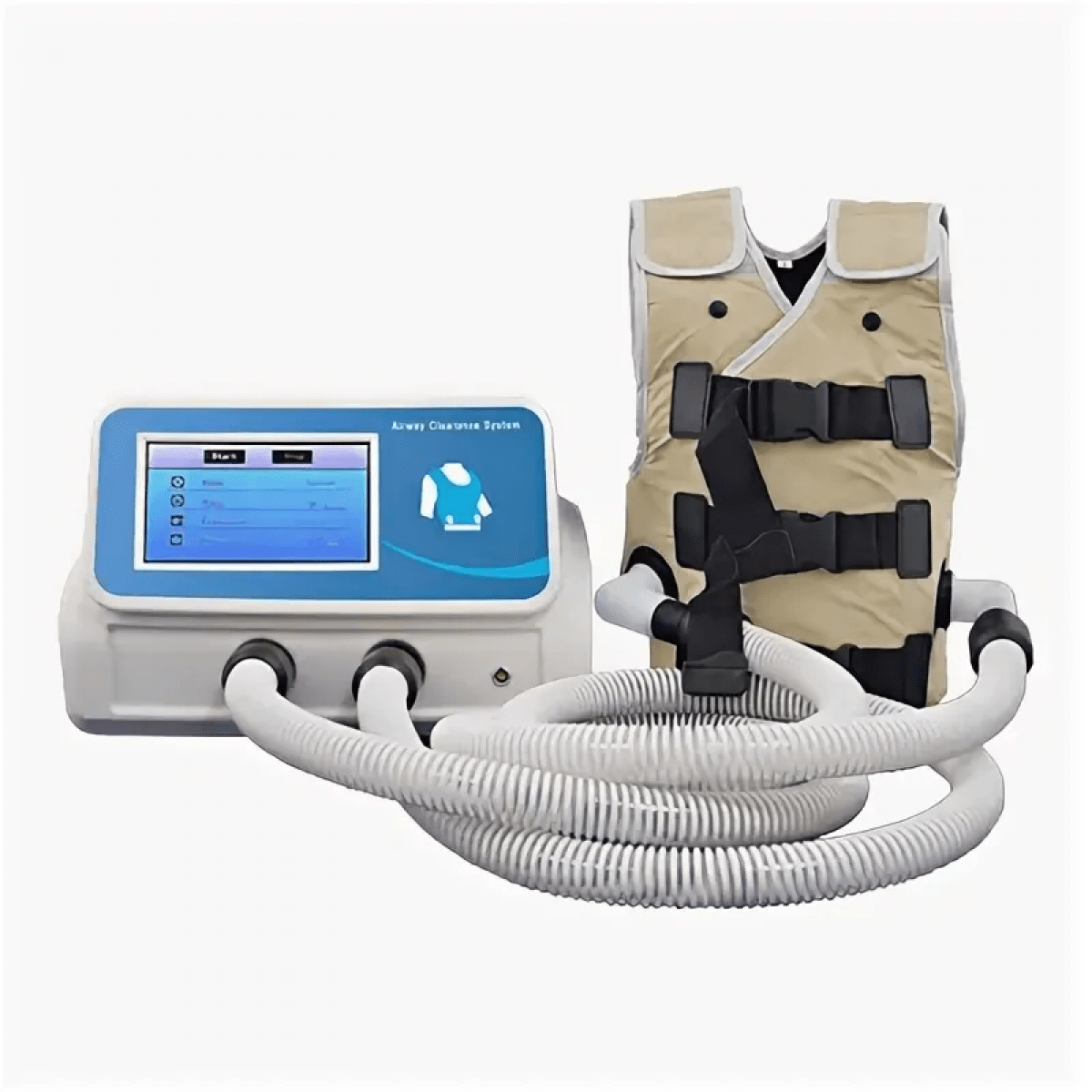 Система работает за счёт воздушного компрессора, который подаёт короткие импульсы воздуха в жилет. Жилет быстро раздувается и сдувается, создавая мягкое вибрационное давление на грудную клетку. Такое воздействие разжижает мокроту, ускоряет её движение к верхним дыхательным путям и формирует эффект «мини-кашля», который помогает организму выводить слизь естественным образом. Благодаря этому процедура становится эффективной альтернативой ручному перкуссионному массажу и позволяет проводить терапию дома без посещения стационара.